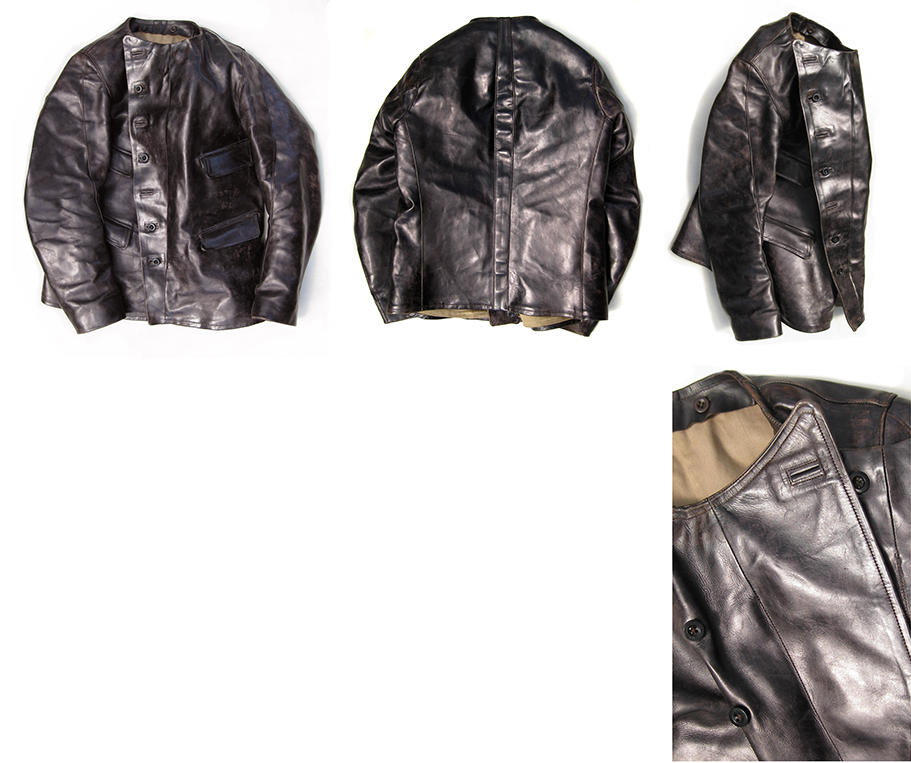 the jacket using four to six quality 1.2mm thick “Kerralia” calf skins. Each can be individually dyed with an antique finish.